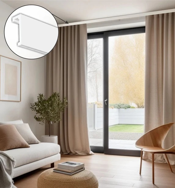 Masca imbina functionalitatea cu estetica moderna, oferind o modalitate simpla de a acoperi si finisa sina perdelei, printr-o linie vizuala continua deasupra ferestrei. O solutie eleganta si practica pentru finisarea zonei de prindere a perdelelor si draperiilor. Masca este proiectata si pentru montarea iluminarii cu banda LED.